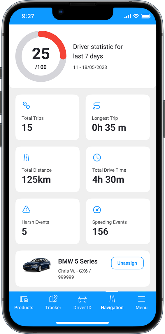 The app provides detailed trip statistics, highlighting instances of speeding and harsh driving that affect the driver’s score. Users can explore trip records, filter data, and analyze performance across classifications and time periods.